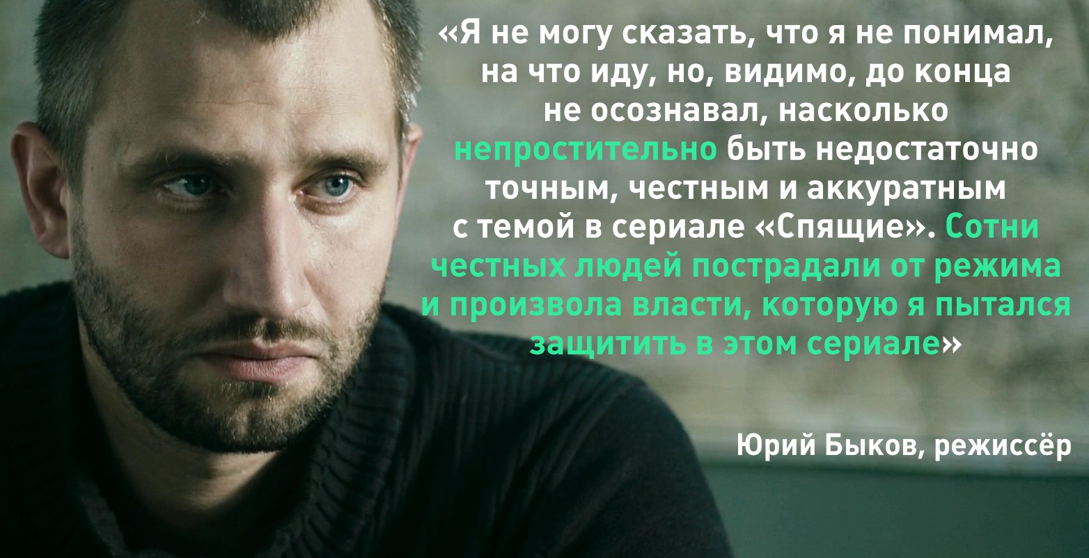 Сам Быков при этом выходил на митинги на Болотной, но он же выражал несогласие с популярной у некоторой части либеральной общественности антироссийской риторикой во время конфликта на Украине. По признанию режиссера, его раздражали высказывания многих пользователей соцсетей, особенно по поводу трагедии в одесском Доме профсоюзов. Собственно, на этой волне он и согласился снимать «Спящих». Теперь Быков оценивает результат этого решения: